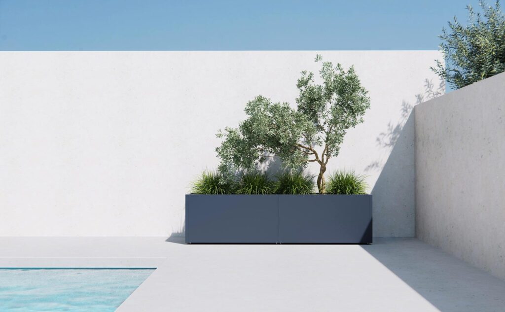 Nuestro sistema modular de cubos y jardineras metálicas, con modelos de distintas alturas, profundidades y longitudes, ofrece la posibilidad de crear composiciones individuales, en línea y de esquina, sin límites dimensionales.